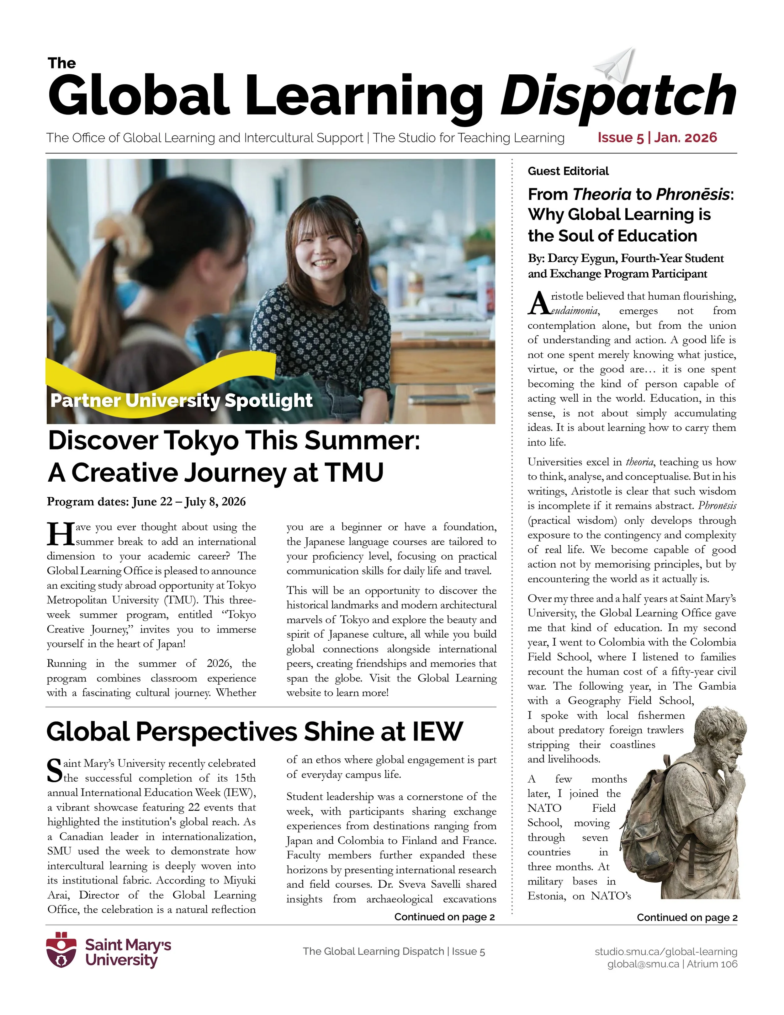 The Global Learning Dispatch is the monthly newsletter from the Office of Global Learning at Saint Mary’s University. It provides a forum for connecting you with international study opportunities, faculty insights, and a supportive community for intercultural learning. In each issue you’ll find articles spotlighting partner universities around the globe, a monthly column offering guidance on thriving abroad, and the latest updates on intercultural events on campus.