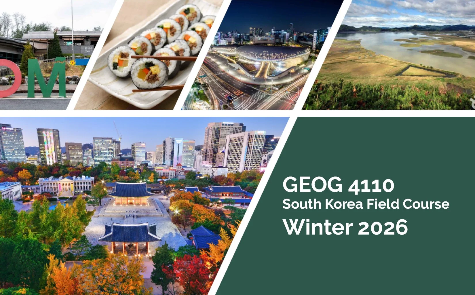 The GEOG 4110: South Korea Field Course provides an opportunity to study the dynamic geography of South Korea (Republic of Korea). Through engaging in-class seminars and an enriching field trip to the country, students delve into diverse aspects of South Korea's physical and cultural landscape. The main themes of the course may change over the years with faculty interests and collaborative opportunities, ensuring relevance and dynamism. By adopting an integrative regional geography perspective, students gain insights into the past, present, and future of South Korea, fostering a comprehensive understanding of this vibrant nation.